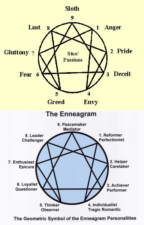 As is also obvious, there's 9 (8) sins listed here, not 7. But there are usually 7 deadly sins, right? Thing is, that this isn't based on the 7 deadly sins, but on the Enneagram of Sin.