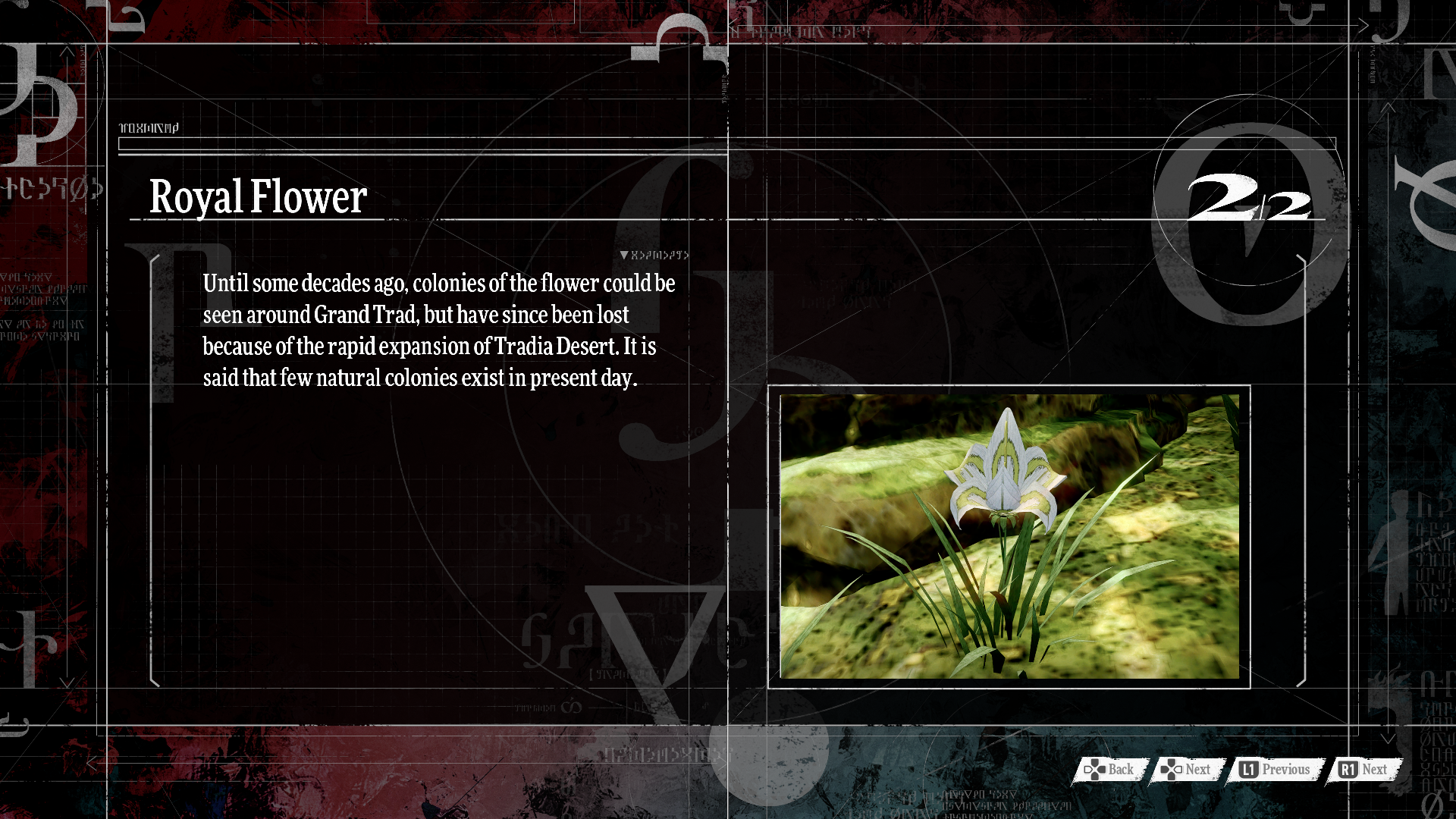 As mentioned earlier, the Royal Flowers originally came from the Eldan Sanctum. It's said that these flowers were once more prevalent in the area surrounding Grand Trad, but few natural colonies remain today. They have not been given a name, nor is their significance clear, but given how they have been used in the game (on the coffins of deceased Elda, at the king's funeral), one can speculate or assume that the flowers have a funerary meaning.