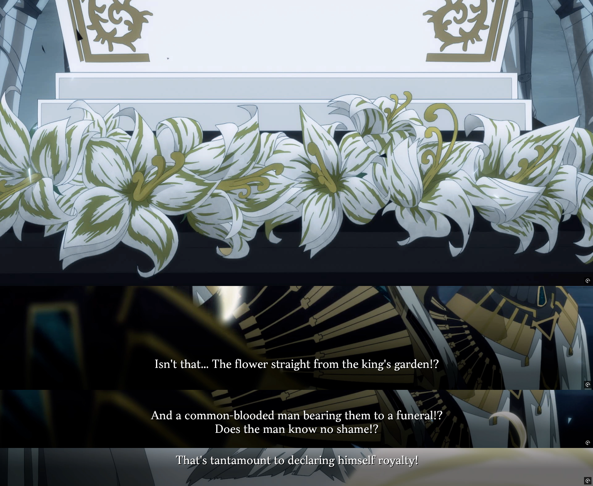 In any case, what I personally believe is that the flowers are a way of mourning his “family” or that it is his obsession with the king that makes him mourn for him.