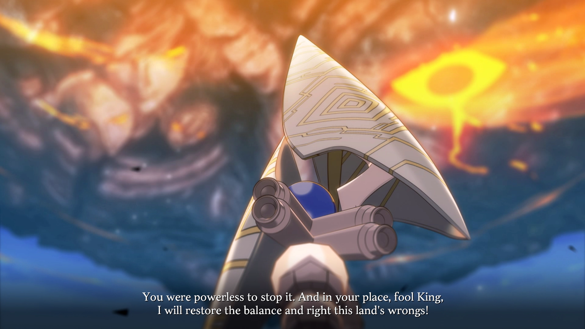 And then, most importantly, it's this dialogue which is: "I shall claim the ideals you abandoned, and finish it in your stead" (but with his own twist, which, as we know from the game, is to return anxiety to the people)
