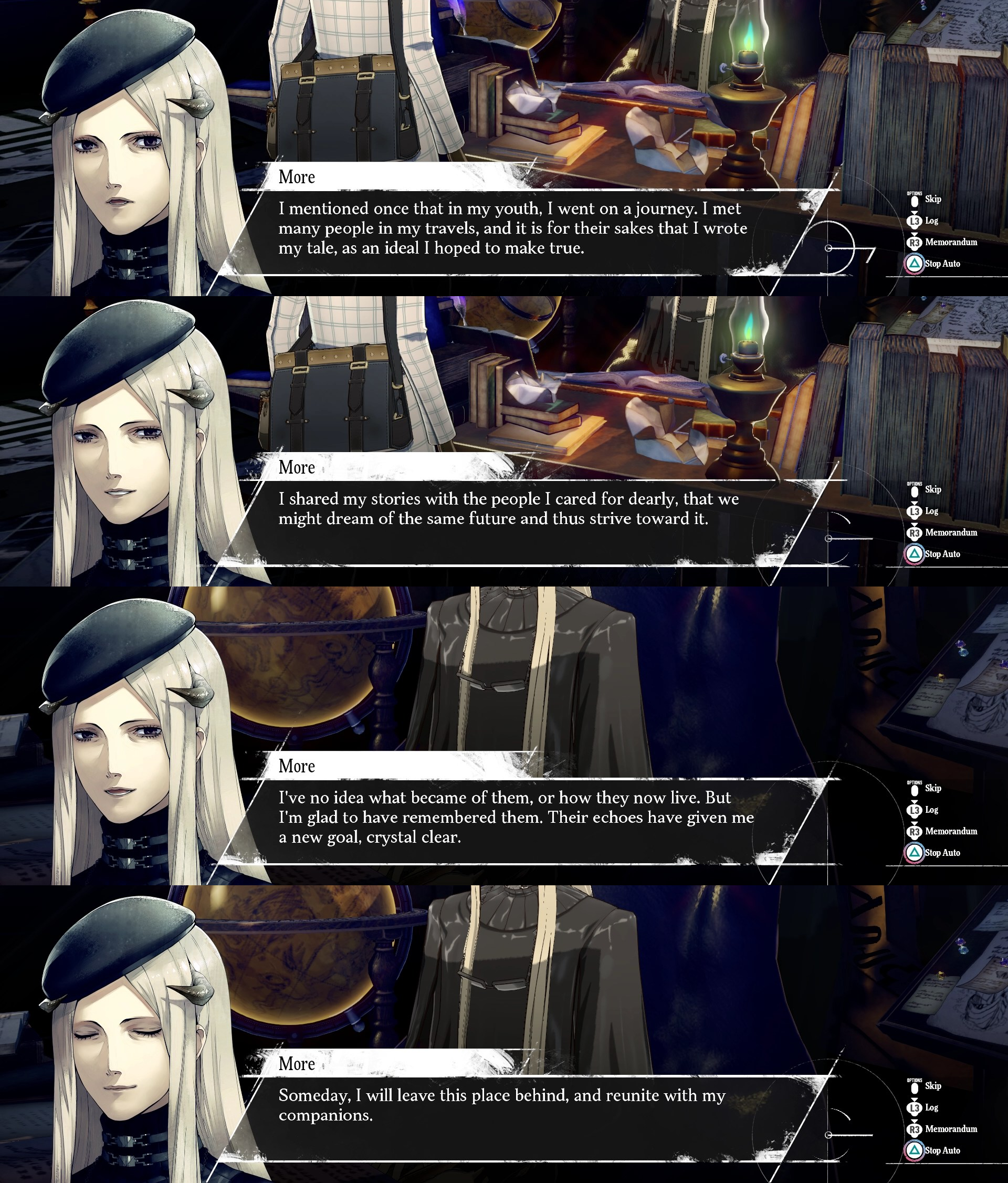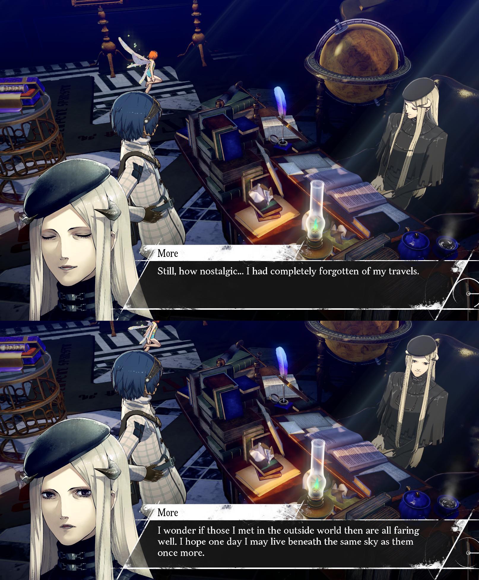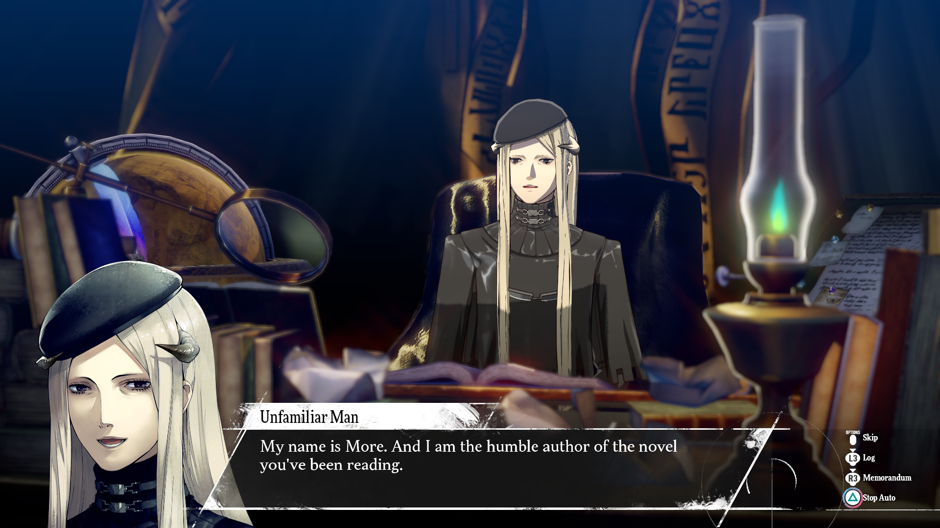 Shortly after reading the novel for the last time, More summons the Protagonist to Akademeia. After a couple of exchanges about his newfound archetype, the mysterious voice speaks to them both, vaguely alluding to her existence, and More still cannot remember who it might be. When he's about to remember, the Protagonist is quickly forced out of Akademeia. Once this is over, the Protagonist muses that he now remebers that More is the author of the fantasy novel, and wonders if he has ever visited the Sanctum