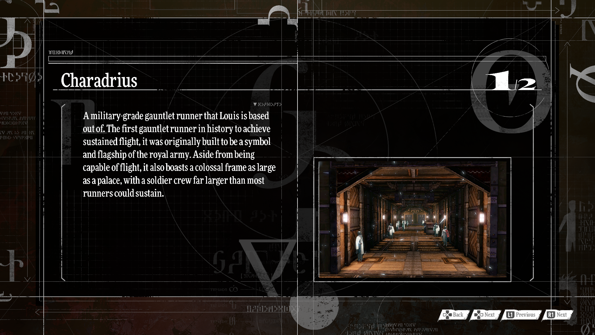 As a note, the Charadrius is NOT originally owned by Louis, nor was it created by him or made for him. The game suggests that the development of the “Charadrius” vessel was a Gaunlet Runner property of the Euchronian State/Army and could have been assigned to Louis if he had become a general in proper, as it was speculated that he'd rise to that position.