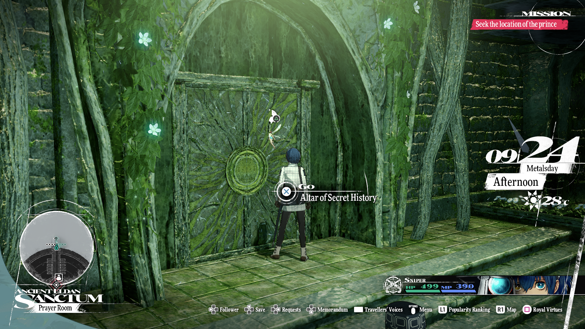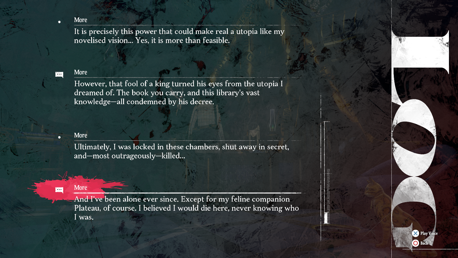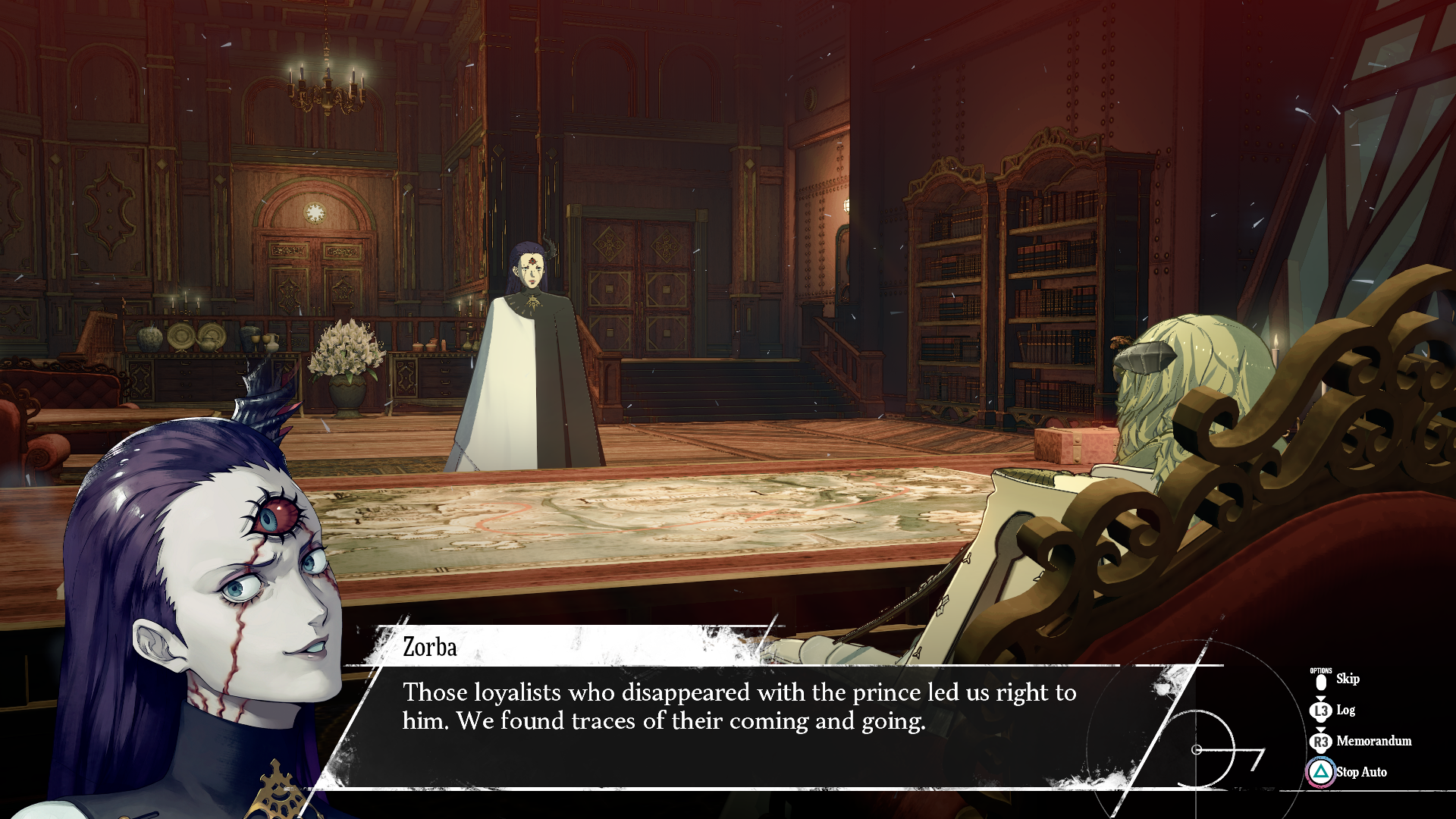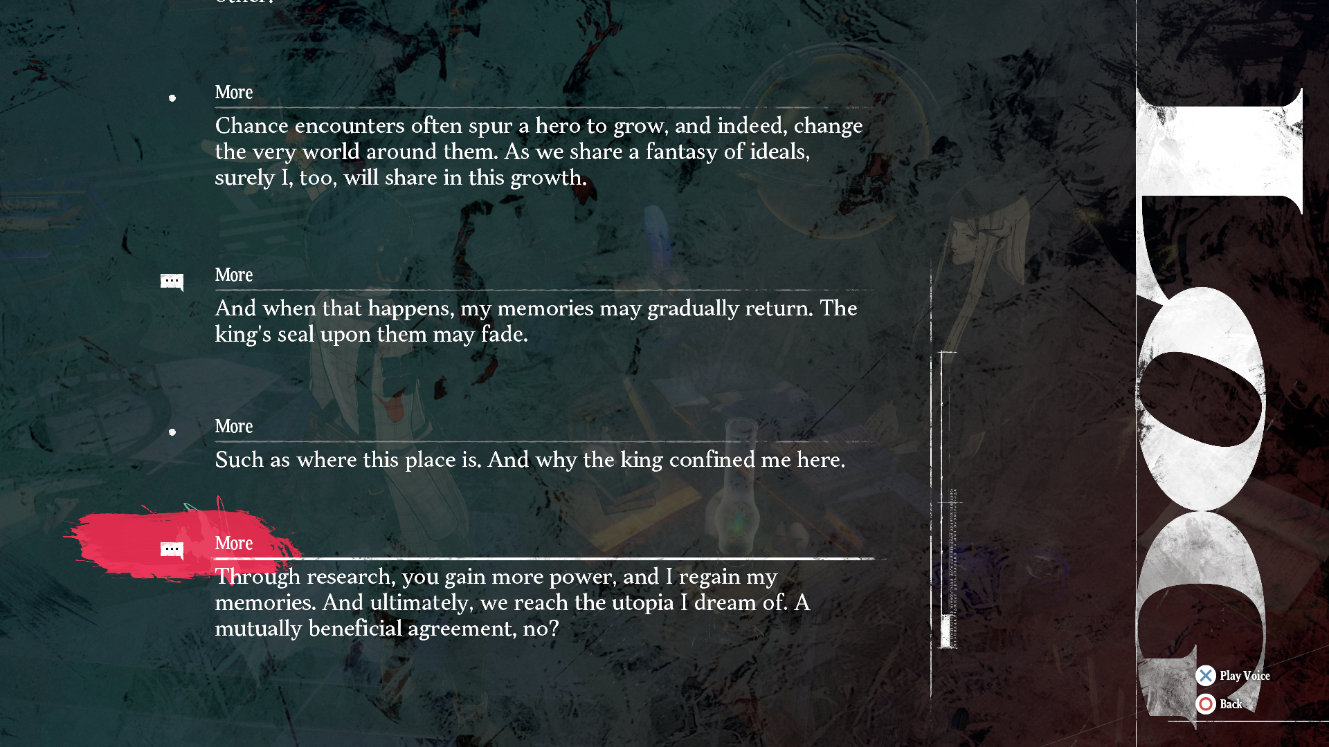 A detail that can be easily overlooked (specially on a first playthrough) is that the Player is capable of exploring special rooms (namely 'Prayer Room' and 'Altar of Secret History') before being forced to move on to the scene where the identity of the 'Prince' is revealed, being forced to enter the Altar of Secret History only to have Gruidae give more exposition. Once Zorba's presence is discovered, no detours are allowed.