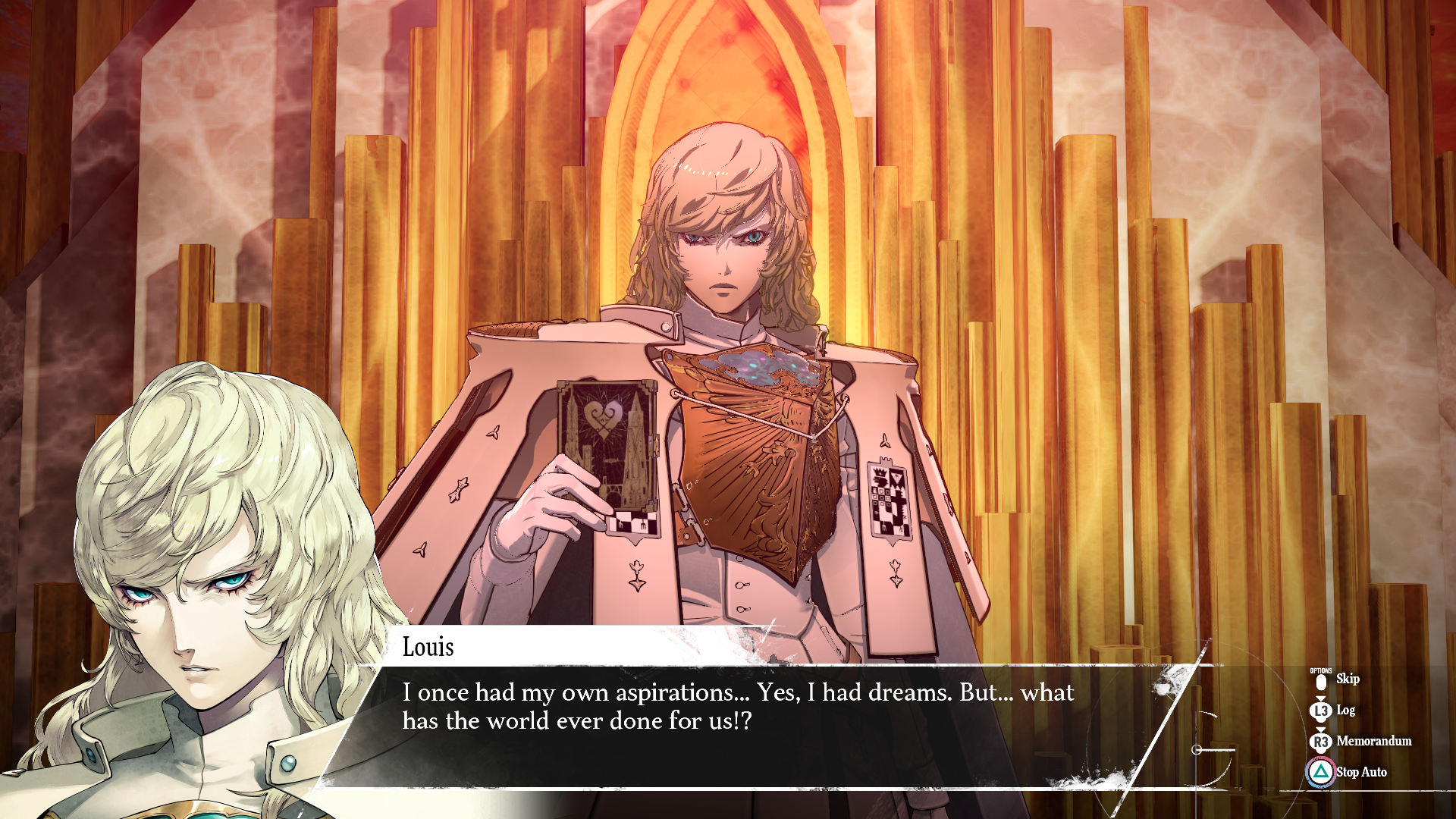 When the protagonist is forced to choose whether or not to accept Louis's deal regarding his ideal world, rejecting the proposal causes Basilio to call Louis out on his hypocrisy, which in turn makes Louis to lose his temper and retaliate by saying, "I once had my own aspirations... Yes, I had dreams", indicating that his current ideals were not what he originally had believed in and that they had changed upon facing the cruelties of the world.