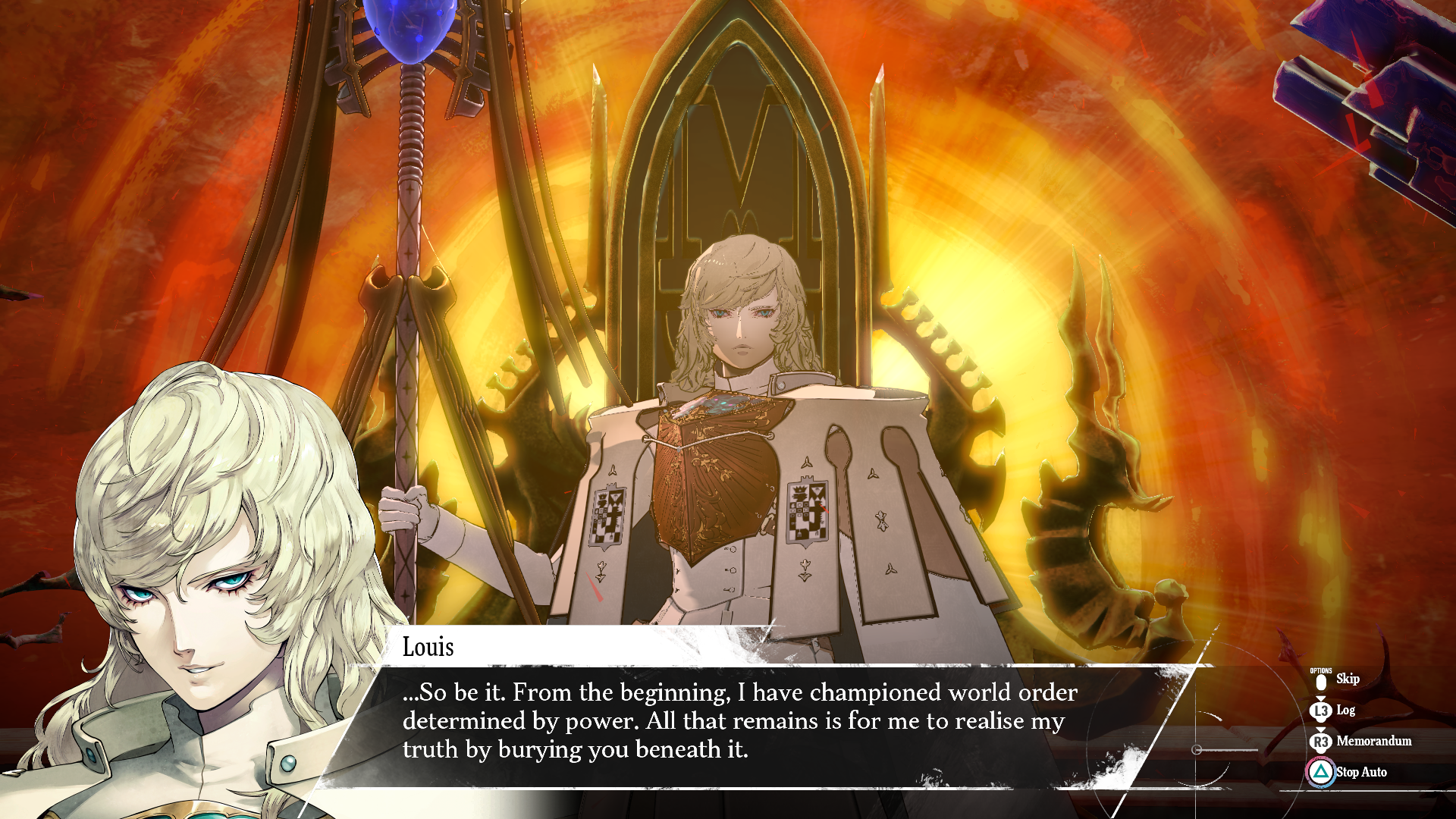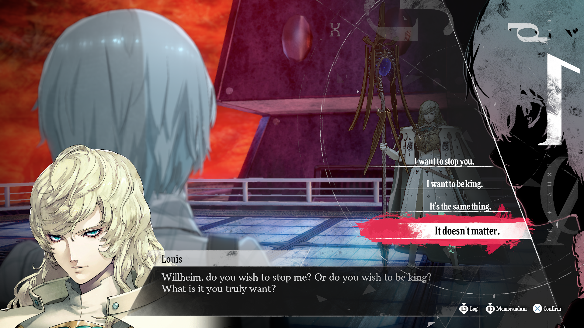 Louis neither agrees nor disagrees, he simply changes the subject and preparess to engage in battle by using the Royal Scepter to grant himself an 'archetype', appearing in his boss form, “Archdemon Louis Charadrius.”