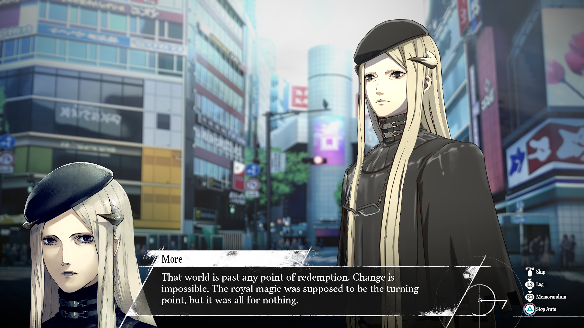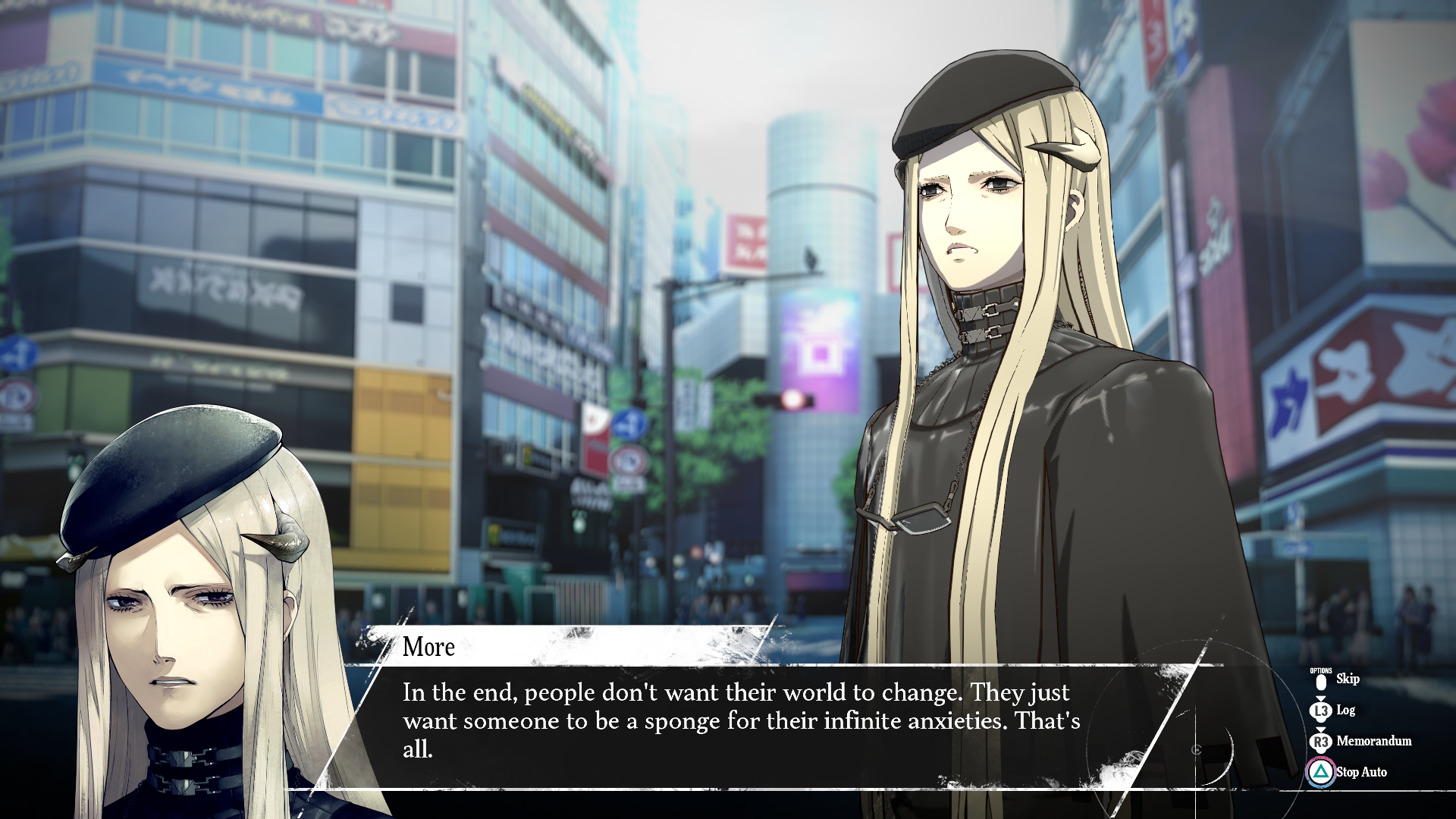 “More” at this point in the story, in this specific cutscene, acts completely differently than usual. This “More” has a totally different outlook on the world, more nihilistic and negative. It's impossible to change the world, and people just want “a sponge for their anxieties”